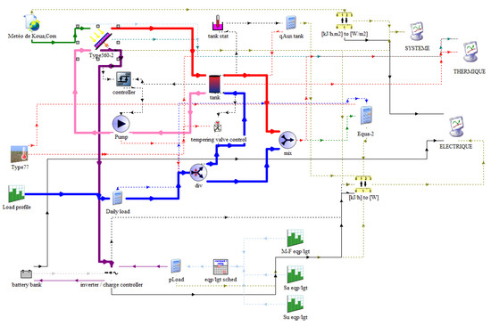 The numerical simulation of the studied system was carried out using the dynamic thermal simulation tool Trnsys. The latter has the advantage of a modular graphical interface where different unit models can be combined in order to simulate the operation of a complex thermal system.