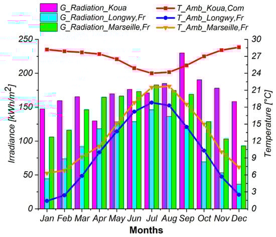 Mean values of solar radiation and ambient temperature in Koua, Marseille, and Longwy cities.