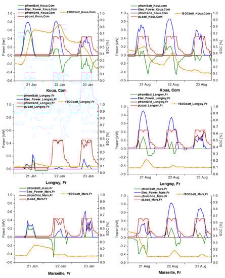 During the three winter days illustrated, as the electrical production depends directly on the solar radiation, the electrical production in Koua is clearly higher than in France, especially in comparison with Longwy (up to 0.81 kW in Koua, about 0.4 kW at Marseille and only about 0.2 kW at Longwy). Indeed, we observe, during these three days, there was no need to connect to the grid in Koua since the solar energy produced perfectly meets the demand with a battery SOC varying between 20% and 84%. In contrast, the battery in Longwy remains almost flat with only one peak not exceeding a SOC of 14% which is discharged immediately (see Figure 7, left). It is worth noting that during the day, the system stores the excess energy in the batteries and uses it at night and non-sunny periods.