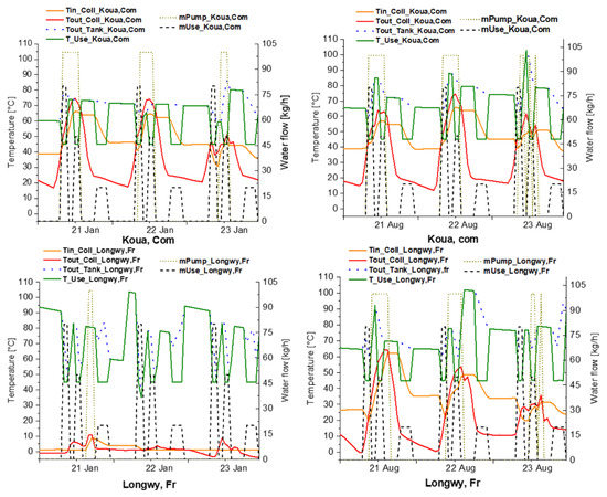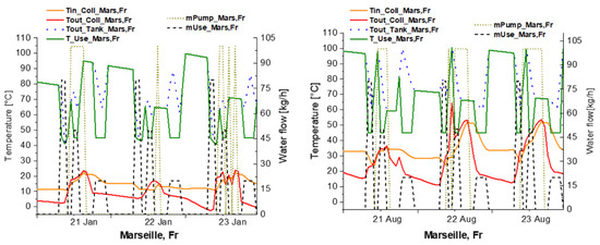Figure 8 illustrates, like Figure 7, the variations of certain quantities in the three cities during three days of winter (left) and three days of summer (right). On each graph are plotted on the left-hand axis in the following order: the temperature of the water at the inlet to the collectors, the temperature of the water at the outlet from the collectors, the temperature of the water at the outlet from the hot-water tank, and the temperature of use, which is set at 45 °C. On the left-hand axis, the following are plotted in order: the mass flow rate in the collectors set in motion by the pump and the DHW consumption flow rate given by the scenario considered in Figure 5. It is important to highlight that the temperature of the water at the outlet of the collector and the temperature of use plotted only have a real meaning when the flow of water in the collectors and the flow of hot water consumed are not zero.