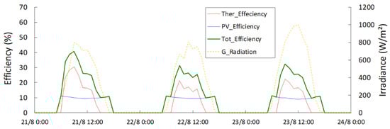 Thermal, electrical, and total efficiencies of the PVT system in Koua during three typical summer days.