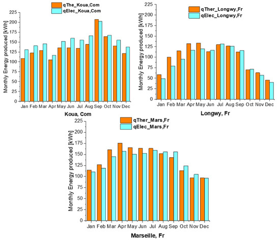 The useful thermal and electrical energy produced by the PV/T plant during the year were integrated monthly and are presented in Figure 10 and Figure 11. Figure 10 allows the comparison of the system performance in the three considered climates. We can see that the use of this technology allows a fairly regular production throughout the year in a country with a tropical climate such as the Comoros. Indeed, apart from September, electric and thermal power produced in Koua vary between 105 and 170 kWh/month while in the two French cities, the production varies twofold between winter and summer. The maximum solar energy production occurs in the summer period due to the maximum solar radiation during this period. In the Union of the Comoros, in September, there is a maximum production of thermal and electrical energy respectively in the order of 207.5 and 202.7 kWh/month. The installation in Longwy produces a maximum of 133.67 kWh of thermal energy and 131.37 kWh of electrical energy per month. As for the city of Marseille, it produces a maximum of 157.51 kWh/month of electrical energy against 175 kWh/month of thermal energy.