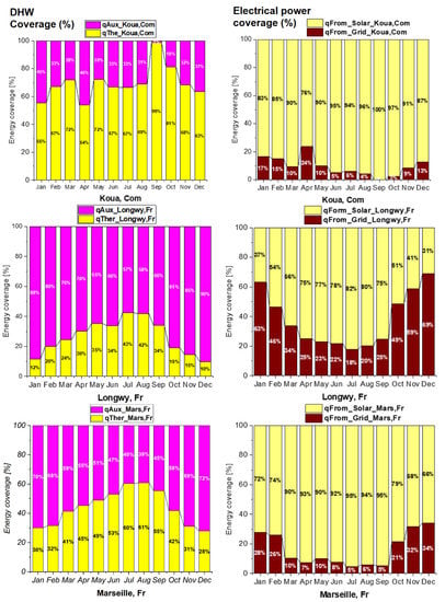 Apart from the comparison of the useful thermal and electrical power produced, it is essential to compare the solar coverage rate between these three sites, i.e., the proportion of electricity and hot water needs covered by the PV/T system. Figure 11 illustrates the solar coverage rate for electricity and DHW in the three cities month by month. In this figure, the solar coverage rates are shown in yellow. This figure shows that solar energy covers, all year round, about 70% of the DHW needs in Koua, while it only covers 10% to 40% of the needs in France depending on the season (10% in winter and 40% in summer). As for the electrical needs, the PV/T installation covers about 80% of the charge in summer in Longwy against nearly 95% in Koua and in Marseille. On the other hand, in winter, while the rate of electrical coverage drops to 30% in Longwy, it is maintained in Koua between 80% and 90% (vs. 70 in Marseille).