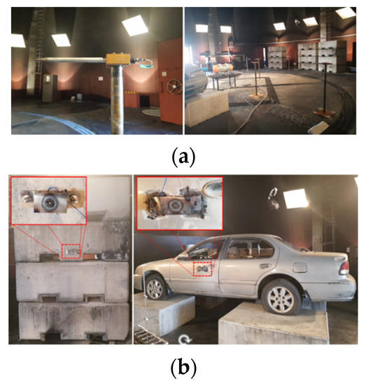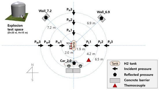 A pressure gauge (Sensys PHP 1500 bar) and three thermocouples (K-type) were installed in the space to observe the hydrogen tank and heating conditions during the explosion, and the shock wave generated by the explosion was measured using multiple pressure gauges (incident pressure and reflected pressure) to capture its effects on the environment, considered in this study using a passenger car and two protective walls placed in the space, as shown in Figure 3. The incident pressure was measured using pencil-gauge-type static pressure sensors (PCB PIEZOTRONICS, Model 137B24B) placed 1.2 m above the ground and installed at horizontal distances of 1.9, 4.2, and 6.5 m from the hydrogen tank to the east, west, and north directions as in references [7,8,15]. The reflected pressure (PCB PIEZOTRONICS, Model 111A24) was measured at the center of the front door of a 2000 cc passenger car located 2 m to the south, at a concrete protective wall located 6.7 m to the northeast, and at a concrete protective wall located 7.2 m to the northwest of the hydrogen tank center. The DAQ used for pressure measurement was a DEWESoft SIRIUS series data logger, and it measured 500,000 data per second. Images were captured throughout the heating process using a set of general closed-circuit television cameras installed in the test space to provide visual evidence of the explosion as it occurred.