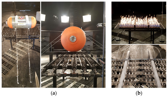 The experiment was carried out in a cylindrical explosion test space with a diameter of 20 m and a height of 15 m. As shown in Figure 1, a hydrogen tank for an FCEV was installed in the center of the space and detonated by heating under specific temperature conditions according to Global Technical Regulation No. 13 (GTR 2013) for engulfing fire tests [14]. The hydrogen tank was a Type IV tank produced by company I (870 mm (L) × 363 mm (D)) that passed both pressure and heat resistance tests. The tank was fixed above the heating source using a wire and filled to a pressure of 70.7 MPa, which is consistent with the typical hydrogen FCEV filling condition. The TPRD was removed from the tank to ensure an explosion, and the tank was finished with an end plug in its place. Finally, a pressure gauge was installed in the tank to observe the change in its internal pressure during the heating process.