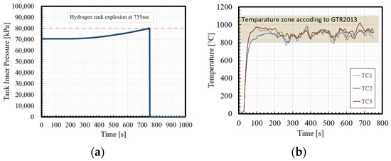 - When the Type IV hydrogen container was heated to a certain temperature (800–1100 °C) by an engulfing fire, it exploded after 735 s. At the time of the explosion, the pressure inside the container was 80.0 MPa, approximately 9.3 MPa higher than the initial pressure (70.7 MPa).