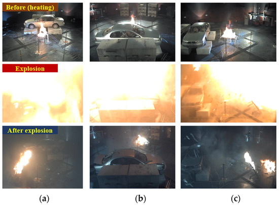 Scenes of the hydrogen tank explosion test in each direction: (a) left side; (b) right side; (c) front side.