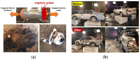 Observed damage to the hydrogen tank and vehicle: (a) exploded hydrogen tank; (b) vehicle damage.