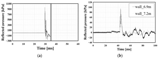 Figure 8b shows the reflected pressures measured by the sensors installed on the protective concrete walls to analyze the effects of the explosion on structures. Maximum reflected pressures of 94 and 85 kPa occurred at the protective wall 6.9 m to the northeast and 7.2 m to the northwest, respectively. These pressures were higher than the incident pressures measured at a relatively closer distance (PE, PN, and PW 6.5 m), because the total pressure, which includes the dynamic pressure, was measured as the reflected pressure at the walls.