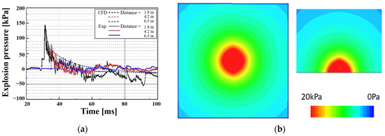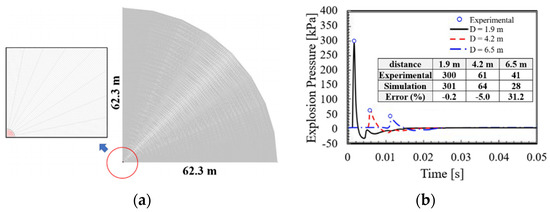 Verification of CFD analysis model using the open explosion condition: (a) numerical analysis model schematic; (b) comparison of simulation and experimental [7] results.