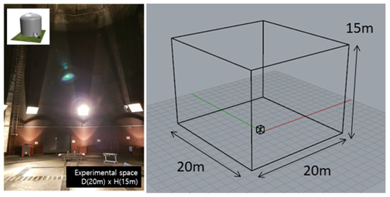 A semi-enclosed space with a floor area of 400 m2 and height of 15 m was set as the analysis model space to verify the accuracy of the hydrogen tank explosion simulation in a semi-enclosed space. For comparison with the results of the experiment, domains of the same size as the experiment were selected and shown in Figure 10. The hydrogen tank was located in the center of the space, where the initial temperature and pressure of the air were set to 300 K and 101,325 Pa (atmospheric pressure), respectively. Immediately before the explosion, the hydrogen tank was filled with hydrogen with an initial temperature and pressure of 395 K and 70 MPa, respectively. The explosion energy was described using the equivalent TNT model derived in Section 3.1.1, and the hydrogen was set to be released simultaneously with the start of the simulation. The simulation was performed in the unsteady state using a time increment of 2 × 10−5 s. The numerical analysis method was performed in the same manner as the method presented in Section 3.1.2.