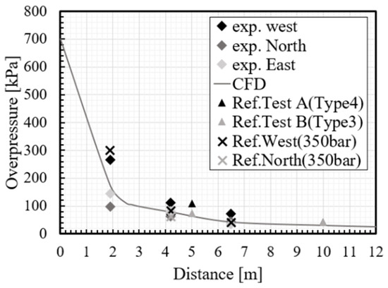 As such, the maximum overpressure induced by the tank explosion was compared with the CFD analysis results and the results of previous studies as shown in Figure 12; the experimental conditions for each case shown in the figure are described in Table 3. The previous studies considered in this comparison comprise open-space explosion tests of different tank types filled to a pressure of 70 MPa conducted by Molcov et al. (2019) (Ref. Tests A and B) and the explosion test of a tank filled to a pressure of 35 MPa conducted by Molcov et al. (2015) (Ref. West and North) [11,18,19].