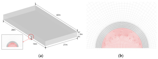 The pressure wave and overpressure propagation characteristics following a hydrogen tank explosion were analyzed in a 42 m × 42 m × 3 m (width × length × height) underground parking garage space, with the hydrogen tank placed at 21 m (center) in the width direction and 28 m (2/3 point) in the length direction. The capacity of the hydrogen tank was set to 52, 72, or 156 L. Immediately before the explosion, the hydrogen tank was filled with hydrogen at an assumed initial temperature of 395 K and pressure of 70 MPa. The initial temperature and pressure of the underground parking garage were set to 300 K and 101,325 Pa, respectively. In the analysis model, only half of the underground parking garage space was simulated by applying the symmetrical condition along the centerline in the width direction, as shown in Figure 13a. The fluid flow was assumed to be in the unsteady state and the time increment was set to 2 × 10−5 s for the numerical analysis. The numerical analysis method was performed in the same manner as the method presented in Section 3.1.2.