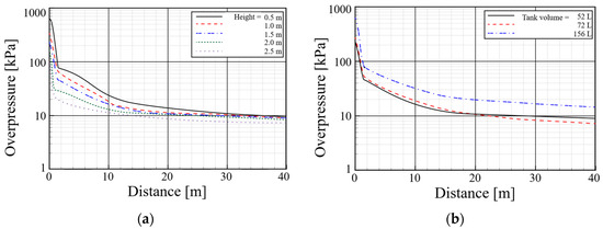 Explosion simulation results at underground parking lot: (a) overpressure according to height (52 L tank); (b) overpressure according to tank volume (1.5 m height).