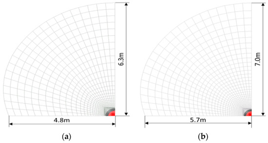 The pressure wave and overpressure propagation characteristics following a hydrogen tank explosion were analyzed using the verified CFD analysis model according to the cross-sectional area of the tunnel and hydrogen tank capacity. The length of the analyzed tunnel was set to 500 m. The tunnel cross section was horseshoe in shape, with an area of either 54 or 72 m2, modeled assuming symmetry about the central plane of the tunnel, as shown in Figure 15. The hydrogen tank was located in the bottom center of the tunnel and evaluated using capacities of 52, 72, or 156 L. The initial temperature and pressure of the air in the tunnel were set to 300 K and 101,325 Pa, respectively. The hydrogen tank was filled with hydrogen immediately before the explosion; its initial temperature and pressure were set to 395 K and 70 MPa, respectively. Once again, the fluid flow was assumed to be in the unsteady state and the time increment was set to 2 × 10−5 s for the numerical analysis. The grid used for analysis was set to a sufficiently small grid size (basic base grid size: 0.012 m) so that the periphery of the hydrogen fuel tank did not affect the quantitative analysis results, and was set in consideration of the analysis economy according to the relationship with the analysis time.