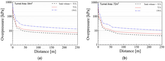 Figure 16a shows the overpressures along the tunnel length according to the hydrogen tank capacity at a height of 1.8 m when the tunnel cross-sectional area was 54 m2. Over the first approximately 16 m, the overpressures sharply decreased from their maximum values of 259, 348, and 680 kPa to 15.7, 20, and 47.5 kPa for hydrogen tank capacities of 52, 72, and 156 L, respectively. At distances beyond 16 m, the overpressure reduction rate was approximately −0.048 kPa/m on average regardless of tank capacity. Generally, the overpressures for the 72 and 152 L tanks were, respectively, 1.3 and 2.5 times higher than for 52 L tank.