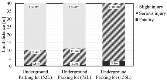 Figure 17 shows the limit distances for each harm stage according to the capacity of a hydrogen tank exploding in an underground parking garage. When the tank capacity was 52 L, the fatality limit distance was 0.8 m, and the serious injury limit distance was 10.4 m. As the tank capacity increased to 72 and 156 L, the fatality limit distance increased to 1.0 and 3.2 m, respectively, and the serious injury limit distance increased to 11.2 and greater than 40 m, respectively. Indeed, the serious injury limit distance significantly increased for a 156 L hydrogen tank.