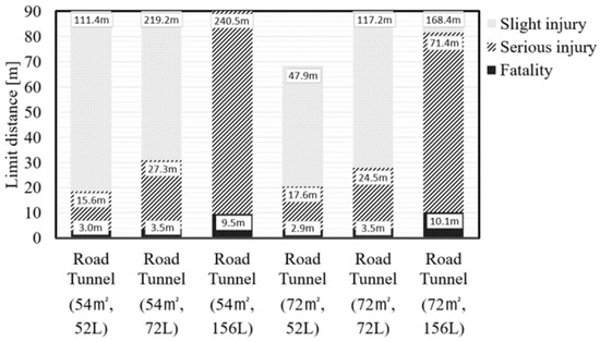 Figure 18 shows the limit distance results for each harm stage according to the capacity of a hydrogen tank exploding in a road tunnel. When the cross-sectional area of the tunnel was 54 m2, the fatality limit distances were 3.0, 3.5, and 9.5 m and the serious injury limit distances were 15.6, 27.3, and 240.5 m for hydrogen tank capacities of 52, 72, and 156 L, respectively. A similar tendency was also observed when the cross-sectional area was 72 m2, with fatality limit distances of 2.9, 3.5, and 10.1 m and serious injury limit distances of 17.6, 24.5, and 71.4 m for hydrogen tank capacities of 52, 72, and 156 L, respectively.