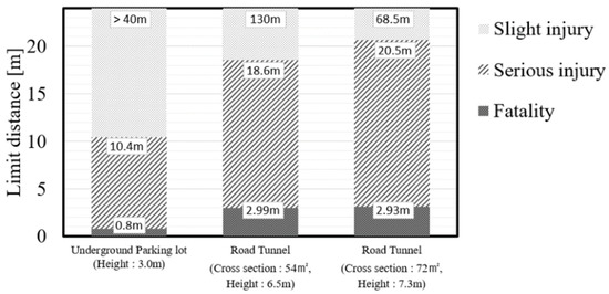 Figure 19 shows the limit distance according to the space condition for the explosion of a 52 L hydrogen tank. For the road tunnel, the fatality limit distance was determined to be approximately 3.0 m and the serious injury limit distance was 18.6–20.5 m regardless of the cross-sectional area. The limit distances for the underground parking garage were quite different, indicating a fatality limit distance of 0.8 m and a serious injury limit distance of 10.4 m. This difference appears to be influenced by the significantly lower ceiling height of the parking garage, but these results also differed considerably from those of previous experiments; therefore, detailed additional research is required.