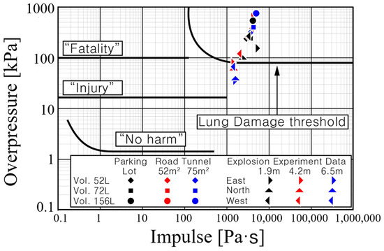 Kashkarov and several other previous studies estimated damage using incident pressure–impulse diagrams [19]. Based only on the limit distance analysis presented above, nearly all human beings will die when exposed to an incident pressure of 200 kPa because lung hemorrhaging will occur with a 99% probability. However, if the impulse, which captures the concept of exposure time to the pressure waves, is used for analysis, more accurate and flexible damage prediction and engineering designs are possible. Figure 20 therefore examines harm using the incident pressure–impulse diagrams for the experiment and CFD results. In this diagram, the CFD results were compared at distances of 1.9, 4.2, and 6.5 m from the hydrogen tank to match the experimental conditions. All the CFD results for the underground parking garage and road tunnel were determined to be higher than the limit indicating death by lung hemorrhage. Among the experiment data, the lung hemorrhage threshold occurred at a distance of 4.2 m regardless of tank capacity, whereas serious injury was found to occur at 6.5 m. This result indicates that the impulse has a larger impact on the degree of damage than the generated incident pressure.