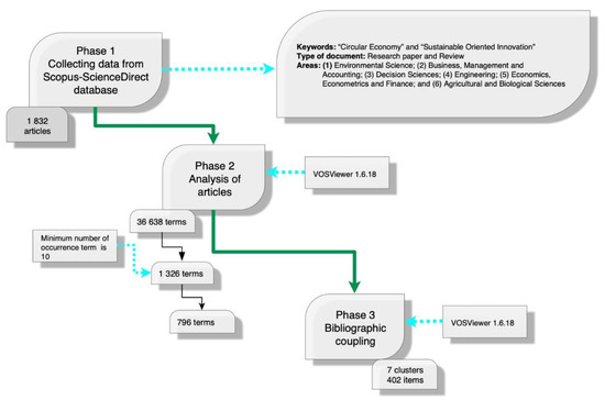 To achieve the research objectives, we used VOSViewer to combine the downloaded data in the form of a research information system [38,39] that was fed to Mendeley [40]. First, we searched for the keywords “circular economy” and “sustainability-oriented innovation”. Considering that environmental concerns are starting to become a trend in various areas, we searched the Scopus-ScienDirect database in the following six main areas: (1) Environmental Science; (2) Business, Management and Accounting; (3) Decision Sciences; (4) Energy and Engineering; (5) Economics, Econometrics and Finance; and (6) Agricultural and Biological Sciences. A search conducted in August 2022 yielded 1832 articles. All articles went through a rigorous review process before being published. During Phase 2, we identified and analyzed articles into 1326 terms in which the minimum number of the occurrence term was 10. In this phase, we selected articles and discarded those that did not meet the criteria, such as duplication, country of research, unsuitable keywords, and inappropriate scope. In Phase 3, we performed bibliographic coupling, resulting in 402 items with seven clusters. In stage 3, we used VOSViewer software to analyze data in the form of a research information system.
