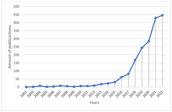 Considering the research trend in environmental management, we combined data sources from six main areas to enhance the analysis and achieve the research objectives. Figure 2 presents information that the topic of the circular economy and sustainability-oriented innovation began to be published in 2003, and then began to increase from year to year. There was especially a spike in publications in 2018 which doubled compared to that of 2017, increasing sharply in 2019 and 2021, and reaching a peak until this data was taken in 2022. This indicates that the linear transition of the economy to a circular economy has become the agenda of researchers in an effort to preserve the environment, especially in the context of the emerging need for a clean energy transition in the face of growing concerns about climate change and the need to increase access to energy [2,5,41,42,43,44,45].