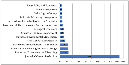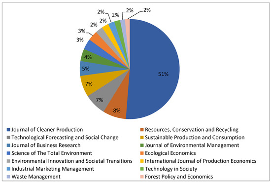 The 1832 selected articles (Figure 3 and Figure 4) were published in several journals including the following: Journal of Cleaner Production (939 articles—51.24%); Resources Conservation and Recycling (138—7.5%); Technological Forecasting and Social Change (131—7.1%); Sustainable Production and Consumption (126—6.8%); Journal of Business Research (88—4.8%); Journal of Environmental Management (73—3.9%); Science of the Total Environment (73—3.9%); Ecological Economics (59—3.22%); Environmental Innovation and Societal Transitions (44—2.4%); International Journal of Production Economics (41—2.2%); Industrial Marketing Management (38—2.1%); Technology in Society (35—1.8%); Waste Management (29—1.54%); and Forest Policy and Economics (28—1.5%). This provides information that this topic is a trending topic in line with environmental conservation efforts [46,47].