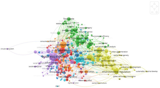 To identify the main research themes in circular economy and sustainability-oriented innovation, we combined the bibliography of these documents with VOSviewer 1.6.18 software. All articles were analyzed by linking a minimum of three articles per cluster. The cluster network is shown in detail in Figure 5.