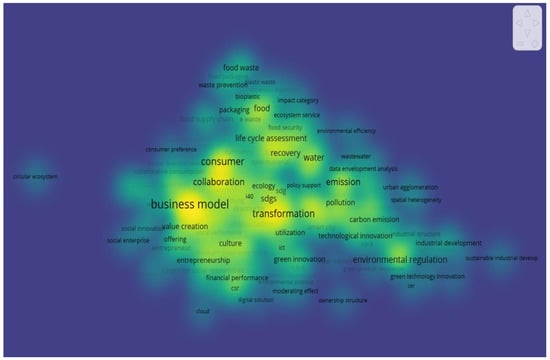 The results of density visualization (Figure 7) show research on circular economy and sustainability-oriented innovation, concentrated on three main topics, namely business model, transformation, and consumer. It then concentrates on several smaller groups, namely collaboration, food, life cycle assessment, recovery, water, emission, environmental regulation, value creation, ecology, industry 4.0, sustainable development goals, pollution, culture, and entrepreneurship.