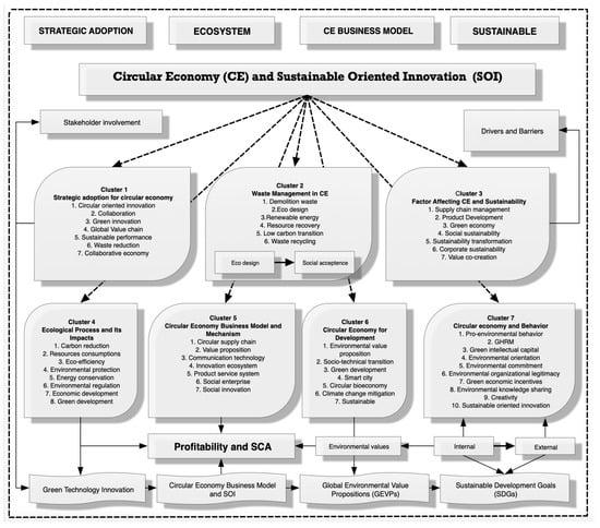 This study seeks to identify the various conditions necessary to advance sustainability-oriented innovation through the circular economy. The number of articles in each cluster of bibliographic coupling shows that the literature recognizes the importance of the interaction between stakeholder engagement, waste management, and the identification of factors in the circular economy (clusters 1–3). However, other emerging topics, reflected in clusters 4–7, are also worth considering and developing, such as ecological processes and their impacts, circular economy business model mechanisms, and circular economy business model for development. As such, an exploration of dynamic resource capabilities and internal resources and activities is needed to take advantage of opportunities to strengthen sustainability-oriented innovation.
