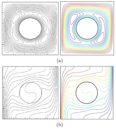 - Costa, V.; Raimundo, A. Steady mixed convection in a differentially heated square enclosure with an active rotating circular cylinder. Int. J. Heat Mass Transf. 2010, 53, 1208–1219. [Google Scholar] [CrossRef]