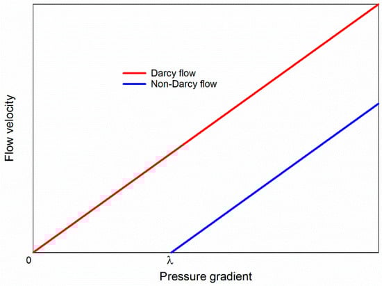 The low-velocity non-Darcy flow phenomenon can be described by the curves shown in Figure 1 where the red curve represents the traditional Darcy flow. However, at the lower pressure gradient region, fluid cannot flow through the porous media unless the pressure gradient exceeds the threshold pressure gradient (TPG). At the region where the pressure gradient larger than TPG, a linear relationship between the flow velocity and pressure gradient can be found. The existence of TPG has been observed from laboratory works [12,13] which can be explained by the effect of tight pore structures, non-Newtonian fluid, and boundary layer [14,15]. Many factors, including pore-throat size, capillary pressure, fluid saturation, and permeability can affect the value of threshold pressure gradient in a tight formation, and the reasonable range of threshold pressure gradient in a tight formation has been reported to be 0.006–0.04 MPa/m [16,17,18]. The TPG can not only result in nonlinear and nonhomogeneous diffusivity equations which are difficult to solve but also can affect the production performance of the tight formations [19]. Numerous attempts have been made to investigate the transient pressure behavior by considering the TPG through both numerical and analytical methods [7,20,21]. However, it is found that the TPG mainly affects the flow regime at late time periods where little information about the TPG can be found from analyzing the early time transient pressure data [7,21]. In order to better understand the reservoir properties with consideration of TPG from the transient pressure analysis method, it is urgent to seek a trustworthy method for such a purpose.
