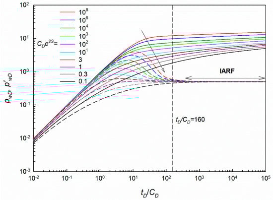 The green lines in Figure 7 represent the relationship between the newly defined parameter ω and the dimensionless time tD/CD. It can be found that these ω curves can be highly dispersed at the early time period which can be beneficial to the analysis and interpretation of the early time pressure response. The ω curves are sensitive for the parameter CDe2S at the early time period, and such new curves can be used for the early time transient pressure analysis. Additionally, it can be found that all the ω curves coincide into a horizontal line with its value equals unity. Even though it can be treated as a characteristic line similar to the horizontal derivative line in IARF regime, it is not very useful for the analysis of the early time pressure response where such a horizontal line may be not present within a limited testing time. Moreover, it can be found that the ω curve shows a straight line and its slope is affected by the value of CDe2S which has been discussed early after the definition of this parameter.