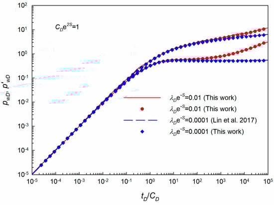 To verify the solutions obtained in this work, the transient pressure behavior was compared with those from previous work [31]. The low-velocity non-Darcy flow model was considered for the tight formation with the following main parameter, CDe2S = 1, λDe-S = 0.0001, 0.01. As shown in Figure 3, there exists a good agreement between the results from this work and those from the literature confirming the accuracy of the solutions in this work to model the transient pressure behavior in a tight formation with consideration of the pseudo TPG. Additionally, it can be found from Figure 5, the existence of TPG can result in an increase of pressure and its derivative curves at the late time period. Additionally, the traditional IARF regime with a horizontal line at late times cannot be observed which can cause more uncertainty during the well-testing interpretation process as the most important flow regime characteristic (i.e., horizontal line with Bourdet derivative equals 0.5) has been changed due to the existence of TPG.