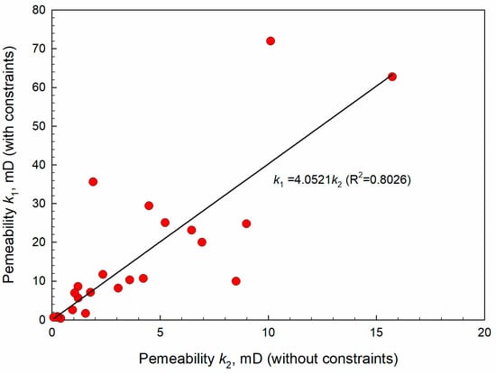 From a numerical point of view, the equivalent well diameter is more reasonable after considering the constraint conditions of the skin factor. Moreover, as the value of the skin factor has been confined to guarantee the correctness of the pressure solution, the influence of the skin factor can be greatly excluded for the early time transient pressure response which brings little interference to the interpretation of the permeability for the near wellbore region. As shown in Figure 6, the permeability obtained after considering the constraints of the skin factor is about 4 times that of the original result without constraints, which can reflect a more realistic seepage capacity of the formation near the wellbore which may be artificially fractured.