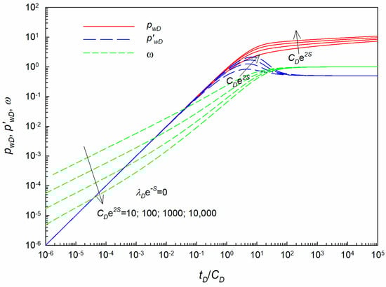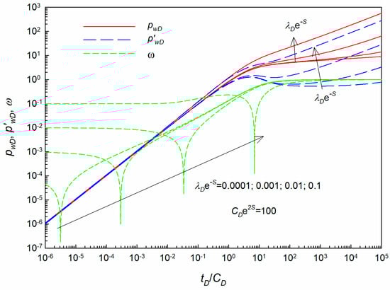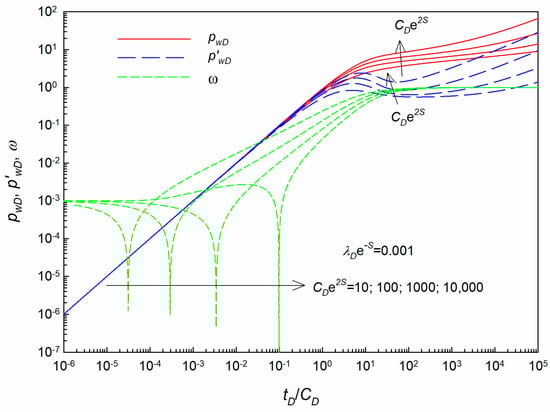 For the low-velocity non-Darcy flow model, the TPG is considered (i.e., λD ≠ 0). The main influencing factors on the type curves include the following combinations: CDe2S and λDe−S. Firstly, new type curves are generated with different values of CDe2S while keeping λDe−S constant. Figure 8 displays the new type curves with various values of CDe2S. It can be found that the pressure and its derivative curves are more dispersed at the transient flow regime and IARF regime due to the existence of TPG. Additionally, the larger the value of CDe2S, the higher the value of pressure and its derivative. As for the ω curves shown in this figure, it is more complicated than those for the Darcy flow model in Figure 7. At the starting time, as the time approaches zero, the ω curves stabilized near a horizontal line whose value equals λDe−S. As explained early, as time becomes smaller enough, the new ω curves have a horizontal asymptote (i.e., λDe−S). As time goes on, the value of the second term in Equation (18) becomes larger which can be in the same order of magnitude as the first term λDe−S. Thus, a singularity point occurs at this curve where the value of the first term equals the second term. After that, the influence of the first term in Equation (18) can get weaker and weaker, and the ω curves gradually approach a straight line. At the late IARF regime, all the ω curves coincide with each other. Moreover, it can be found from Figure 8, the larger the value of CDe2S, the later the appearance of the singularity point of the ω curves, and the smaller the value of the ω function after the singularity point. These specific features can be easily explained by the definition of the ω function where the parameter CDe2S is in the denominator position of the second term of Equation (18).
