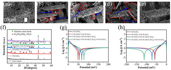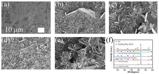 (a) Zinc foil; (b) Zinc anode in ZnSO4 electrolyte; (c) Zinc anode in ZnSO4 + ZnCl2 electrolyte; (d) Zinc anode in ZnSO4 + Zn(CF3SO3)2 electrolyte; (e) Zinc anode in ZnSO4 + Zn(CF3SO3)2 + ZnCl2 electrolyte; (f) XRD patterns of five zinc anodes.