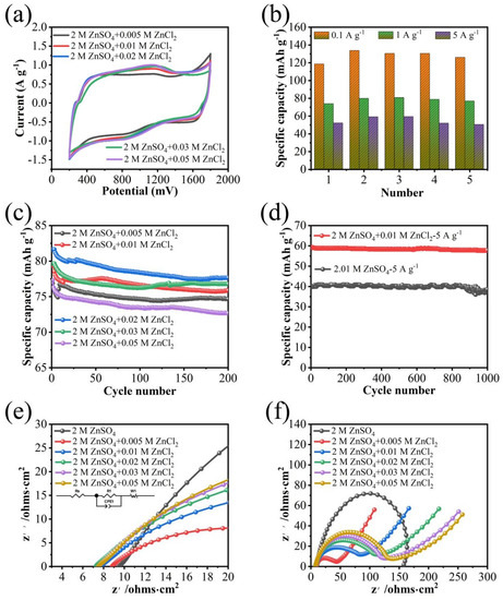 (a) Comparison of five CV curves (5 mV s−1); (b) Numbers 1, 2, 3, 4, and 5 are 2 M ZnSO4 + 0.005 M ZnCl2, 2 M ZnSO4 + 0.01 M ZnCl2, 2 M ZnSO4 + 0.02 M ZnCl2, 2 M ZnSO4 + 0.03 M ZnCl2, and 2 M ZnSO4 + 0.05 M ZnCl2 electrolytes, respectively; (c) Cycling performance (1 A g−1) of hybrid anionic electrolytes; (d) Cycling performance (5 A g−1) of electrolytes with the same Zn2+ concentration; (e) Nyquist plot of hybrid anionic electrolyte in high-frequency region; (f) Nyquist plot of hybrid anionic electrolyte.