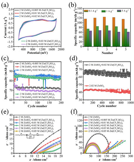 (a) Comparison of five CV curves (5 mV s−1); (b) Numbers 1, 2, 3, 4, and 5 are 2 M ZnSO4 + 0.005 M Zn(CF3SO3)2, 2 M ZnSO4 + 0.01 M Zn(CF3SO3)2, 2 M ZnSO4 + 0.02 M Zn(CF3SO3)2, 2 M ZnSO4 + 0.03 M Zn(CF3SO3)2, and 2 M ZnSO4 + 0.05 M Zn(CF3SO3)2 electrolytes, respectively; (c) Cycling performance (1 A g−1) of hybrid anionic electrolyte; (d) Cycling performance (5 A g−1) of electrolyte with the same Zn2+ concentration; (e) Nyquist plot of hybrid anionic electrolyte in high-frequency region; (f) Nyquist plot of hybrid anionic electrolyte.
