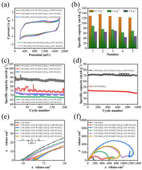 (a) Comparison of five CV curves (5 mV s−1); (b) Numbers 1, 2, 3, 4, and 5 are 2 M ZnSO4 + 0.01 M Zn(CF3SO3)2 + 0.005 M ZnCl2, 2 M ZnSO4 + 0.01 M Zn(CF3SO3)2 + 0.01 M ZnCl2, 2 M ZnSO4 + 0.01 M Zn(CF3SO3)2 + 0.02 M ZnCl2, 2 M ZnSO4 + 0.02 M Zn(CF3SO3)2 + 0.01 M ZnCl2, and 2 M ZnSO4 + 0.03 M Zn(CF3SO3)2 + 0.01 M ZnCl2 electrolytes; (c) Cycling performance (1 A g−1) of hybrid anionic electrolyte; (d) Cycling performance (5 A g−1) of electrolyte with the same Zn2+ concentration; (e) Nyquist plot of hybrid anionic electrolyte in high-frequency region; (f) Nyquist plot of hybrid anionic electrolyte.
