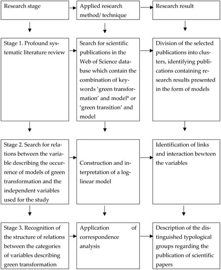 The green transformation has now become one of the more important areas of research, discussed by authors representing diverse disciplines of science. The publications in this area include both the theoretical issues linked with defining the term “green transformation”, as well as present analyses of the current stage of the process of transformation. There are also some popular studies comprising the results of the literature review; however, these are usually limited to a quantitative presentation of the number of citations and number of works indexed in databases. It is far less frequently possible to find their listings of the analysed research subjects and analyses focused on, for example, examining the relations linking green transformation with other areas of research. The published papers mostly have the character of a survey, and the conducted studies in practice do not apply the methods of statistical data analysis. However, besides the knowledge, among others, of how to define green transformation or describe the stages and activities undertaken as part of the process of transition from the conventional economy to that with low or even zero emissions, one should also acquire information about the methods and models employed by scholars to expand the knowledge in this scope.