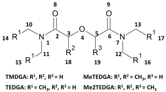 The general structure of DGAs investigated in this study with marked atoms is presented in Figure 1. First, we compared the experimental results of the main degradation products of the molecules with the theoretical ones predicted based on the bond orders obtained by different methods. We also compared each molecule using the CDD and SASA calculations with experimental values of the radiolysis constant.