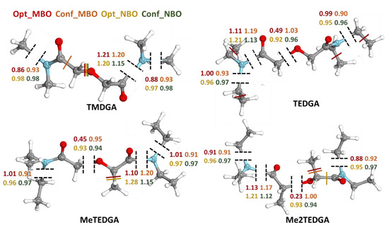 The MBOs determined by using the conf-approach did not show extremely low values. Furthermore, the bond orders were very similar for the symmetrical atoms in the molecules. However, again, the most reactive sites were not obtained correctly. In the case of TMDGA, the method predicted the C2-C3 bond breaking, which was not observed experimentally. The removal of the methyl group was again calculated for the Me2TEDGA molecule. Thus, we finally excluded this approach from further investigation.