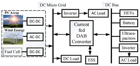 Renewable energy resources require power electronics to make use of the energy that they generate. The importance of power electronics in distributed energy systems is shown in Figure 1. Different types of low-voltage DC DES, which are in operation across the globe, are discussed along with their power and voltage ratings [31]. The voltage-fed DAB and proposed current-fed isolated DAB (CFIBDC) converters are shown in Figure 2a and Figure 2b, respectively. These converters are very useful in charging the battery during daylight hours and discharge the same power from the battery whenever necessary [5]. The CFIBDC shown in Figure 2b consists of a boost stage with ‘Vpv’ as the input voltage, and inductor ‘Lb’, capacitor ‘Cb’, and inductor ‘Ldc’ are used for maintaining a constant current. The switches Q1 to Q4 are on the primary bridge, and Q5 to Q8 are on the second bridge. Diodes D1 to D8 are the anti-parallel body diodes of the switches Q1 to Q8, as shown in Figure 2b. The high-frequency transformer has a turns ratio of 1: n. The elements Lr and Cr are part of the series-resonant circuit. Circuit element Cr aids in avoiding transformer saturation [13,14,15,32]. An inductor Lo can reduce ripples in the load current [28].