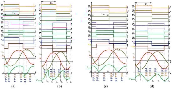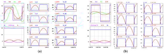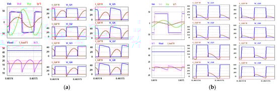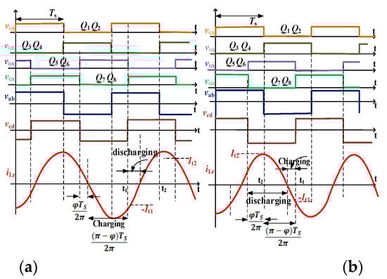 The performance of the current-fed DAB converter can be analyzed by determining the soft-switching range and conditions of the converter. These boundary conditions of the converter are the critical factors that define the soft switching of the converter [33]. This converter is operated under the above resonance method to achieve ZVS for the switches; the corresponding switching pulses, voltage and current waveforms are shown in Figure 7. The two expressions given in (30) are derived by using simple trigonometry for the current waveshapes shown in Figure 7a. The corresponding equivalent circuit, which depicts the waveforms of Figure 7a during the turn-on transient time in the forward mode, is shown in Figure 8a,b, where Cstray,Qz (z = 1~8) represents stray capacitance in parallel with the switches (Q1 to Q8).