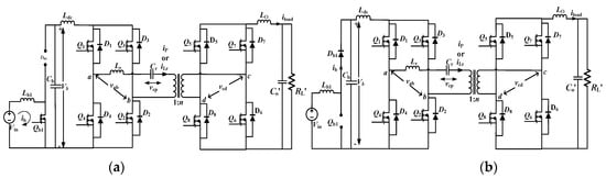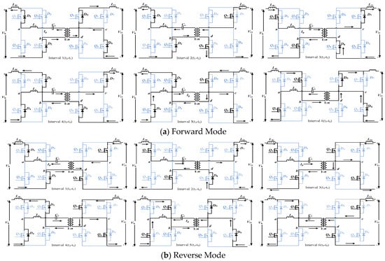 For the CFIBDC converter, a single-phase shift control (SPS) control technique is applied. This technique is the simplest and most-preferred technique for isolated bidirectional dual active-bridge converters. In this technique, diagonal switch pairs in two bridges are turned ON to produce square waveforms having a 50% duty cycle for the respective switches. The square waveforms on either side of the isolation transformer have a phase difference; the leading voltage-side bridge delivers the power to the lagging voltage-bridge side of the transformer. Only a phase-shift ratio (or angle) ‘φ’ is chosen as the freedom of control; adjusting ‘φ’ allows power between the bridges to be controlled [33]. The various operation intervals in the converter’s forward and reverse modes of operation are described in the following subsections. The equivalent circuits during the forward and reverse modes of operation are shown in Figure 4.