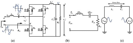 (a) Equivalent circuit of the converter with secondary referred to the primary side, (b). Phasor equivalent circuit at the output terminals of the inverter, (c). Equivalent circuit with the fundamental components of voltages.