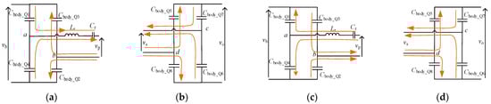 The bridges are symmetrical, so events belonging to Q4 on the input and Q7 on the output bridge are considered. The dynamic expressions (31) belong to the capacitor Cstray,Q4 and the series inductor are shown in Figure 8a,b.