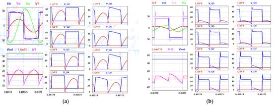 (a). Simulation results in reverse mode (RM) with 100% Load at VBattery = 48 V, vab, vcd, ip and vcr. Soft-switching characteristics for the primary (Q1 to Q4) and secondary side (Q5 to Q8) switches are also shown. (b). Simulation results in RM mode with 10% Load at VBattery = 48 V, vab, vcd, ip and vcr. Soft-switching characteristics for the primary (Q1 to Q4) and secondary side (Q5 to Q8) switches are also shown.