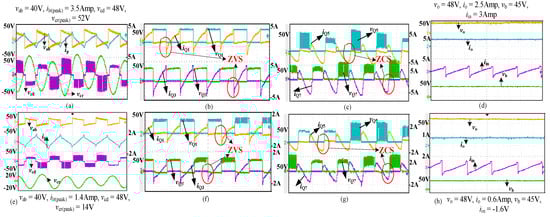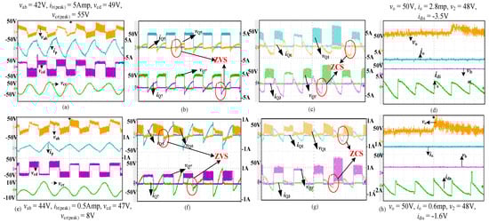 To study the proposed converter’s performance, an experiment has been conducted. Experimental results are taken at Vin(min) and Vo for a variation in load from 100% to 10% in both forward and reverse modes of operation. The specifications and designed values are shown in Table 1 and Table 2. The experimental waveforms are presented in forward and reverse modes. The forward mode has two cases, Case 1 (Full load): square-wave voltages (vab & vcd) across the terminals ‘a’, ’b’ and ‘c’, ’d’ are shown in Figure 12a along with the primary current and voltage across the resonant capacitor. The voltages vab & vcd are the resultant of a single-phase shift control technique. The current flowing through the cross-connected switches such as Q1, Q2 & Q3 and Q4, in a bridge, is the same. The waveforms showing the ZVS for the four switches on the primary side through the complementary switches Q1 and Q3 are shown in Figure 12b. Similarly, the currents flowing through the switches Q5, Q6 & Q7 and Q8 are also the same. The corresponding ZCS for the four switches is shown in Figure 12c through switches Q5 and Q7. The load voltage, load current and input current are shown in Figure 12d, along with the voltage at the boost stage of the converter at 100% load. Case 2 (Full Load): The waveforms, as mentioned above, are shown in Figure 12e–h in the same order at 10% of full load. The reverse mode of operation waveforms are shown in Figure 13. Case 1 (10% of full load): Square waveforms vab & vcd with an input voltage V2 = 48 V and an output voltage Vo = 42.5 V are shown in Figure 13a along with the primary current ip and resonant capacitor voltage vcr. The waveforms showing ZVS for the switches (Q5 to Q8) on the primary side in the reverse mode of operation through complementary switches are shown in Figure 13b. The ZCS for the secondary side switches (Q1 to Q4) is shown in Figure 13c through the voltage and current waveforms of switches Q1 and Q4. The output voltage, load current and input current or discharge current in the reverse mode of operation are shown in Figure 13d. Case 2 (10% of full load): As mentioned above in the reverse mode of operation, the waveforms are shown in Figure 13e–h in the same order for 10% of the full load.